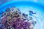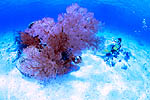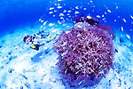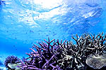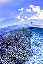 | 沖縄本島、南西約320kmに浮かぶ宮古島は石灰質の地層が生み出す幻想的なホールやケーブの宝庫。そして島の北側、20km沖合いには200ヘクタールもの巨大なサンゴ礁、八重干瀬(やえびし)がある。そこにはいまだ手つかずの枝サンゴが群生する。 |